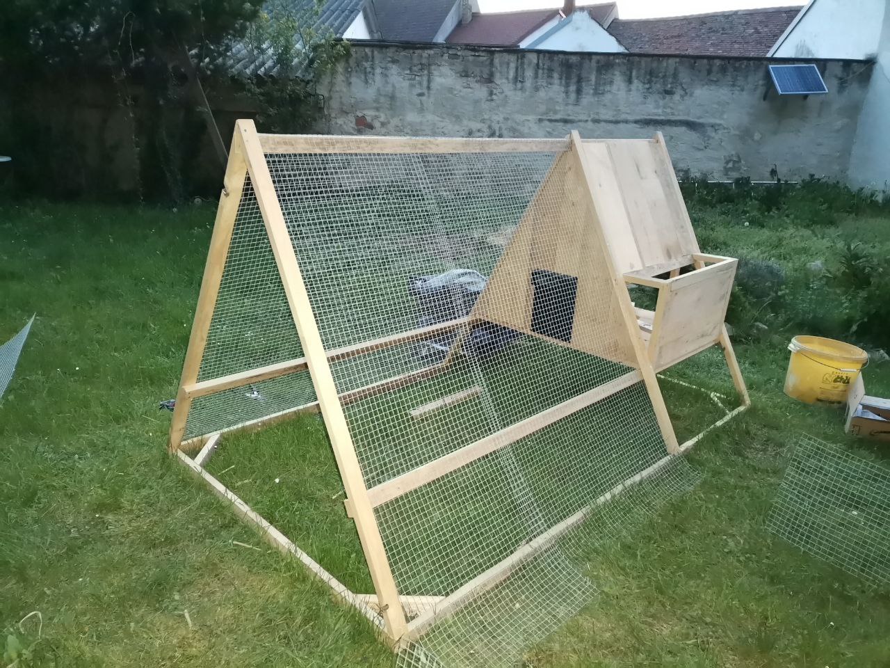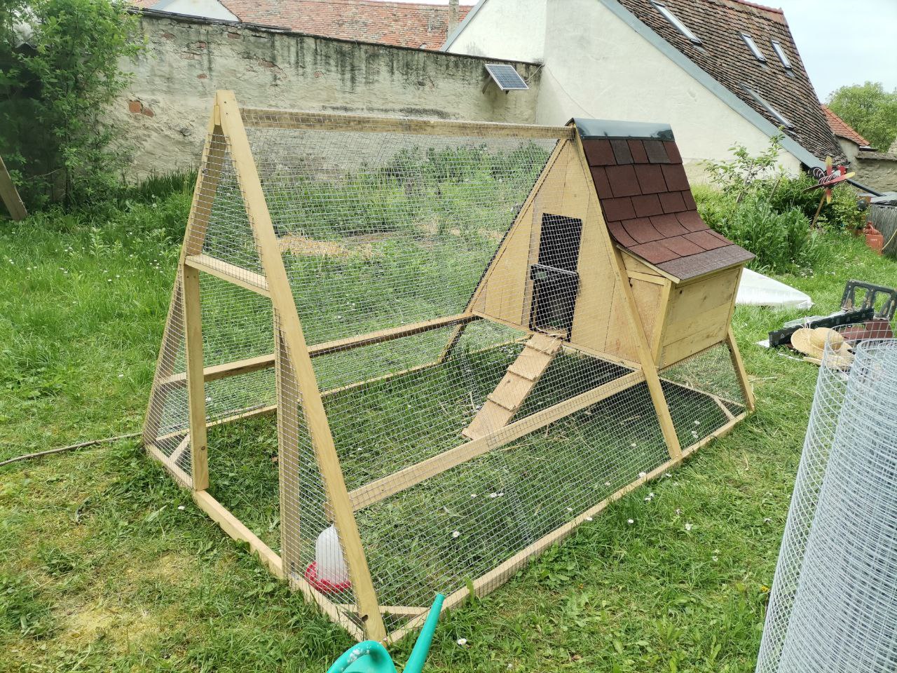 Ein Stall in A-Form hat sich als perfekt herausgestellt: stabil, leicht, gut belüftet und mit wenigen Mitteln umsetzbar. Der Stall besteht aus Holzlatten und Holzbrettern, Wabendraht und einer solarbetriebenen automatischen Hühnertür. Vieles davon lag schon in meiner Werkstatt, nur ein paar Teile musste ich zukaufen.