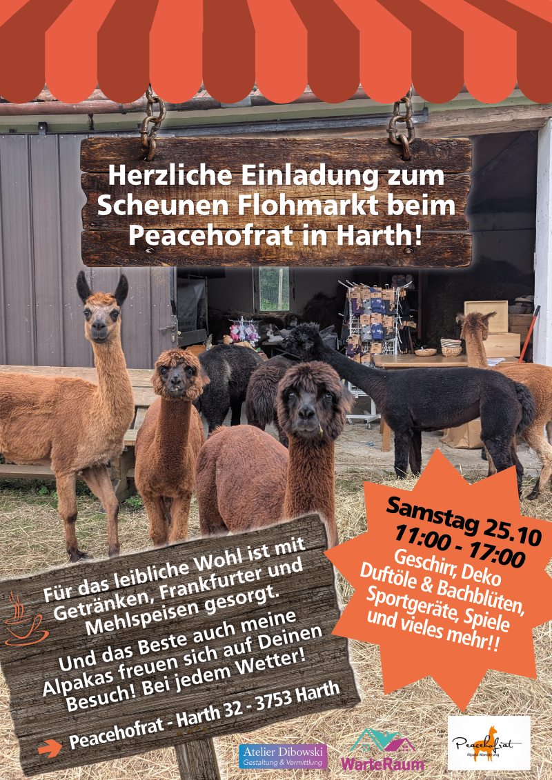 Ich habe für Michael Berner ein Plakat für seinen kommenden Flohmarkt in Hardt gestaltet. Michael bietet Alpakawanderungen an und hat inzwischen einen kleinen Streichelzoo mit Hühnern und Hasen aufgebaut. Alpakas sind in Österreich längst beliebt – sie strahlen Ruhe und Gelassenheit aus und schenken uns Ausgeglichenheit.