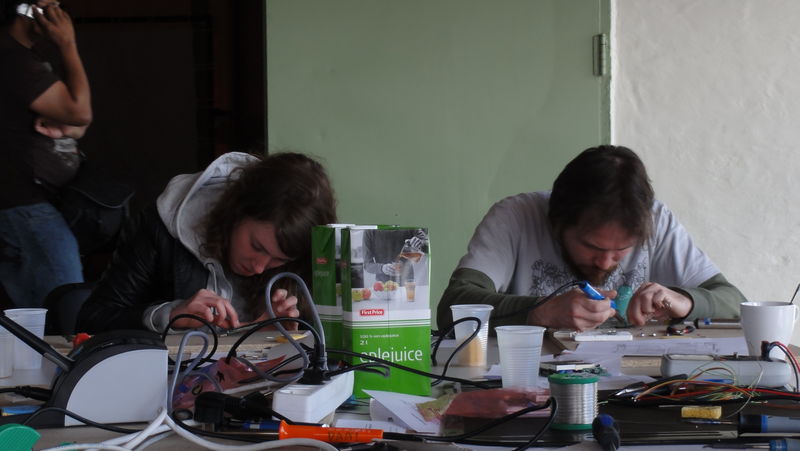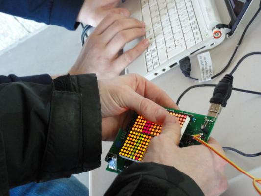 Im Rahmen des Art on Wires Symposiums 2010 in Oslo entwarfen Simon Laburda, Erkin Bayirli, Philip Fischer und ich einen Workshop, bei dem Teilnehmer:innen lernen konnten, wie man eine tragbare LED-Matrix mit 256 LEDs (in drei Farben: grün, rot, orange) lötet und ansteuert. Der Workshop kombinierte technisches Wissen über Mikroprozessoren und Funkkommunikation mit praktischen Löttechniken und ermöglichte es den Teilnehmenden, ihren eigenen kleinen LED-Display zu fertigen.
