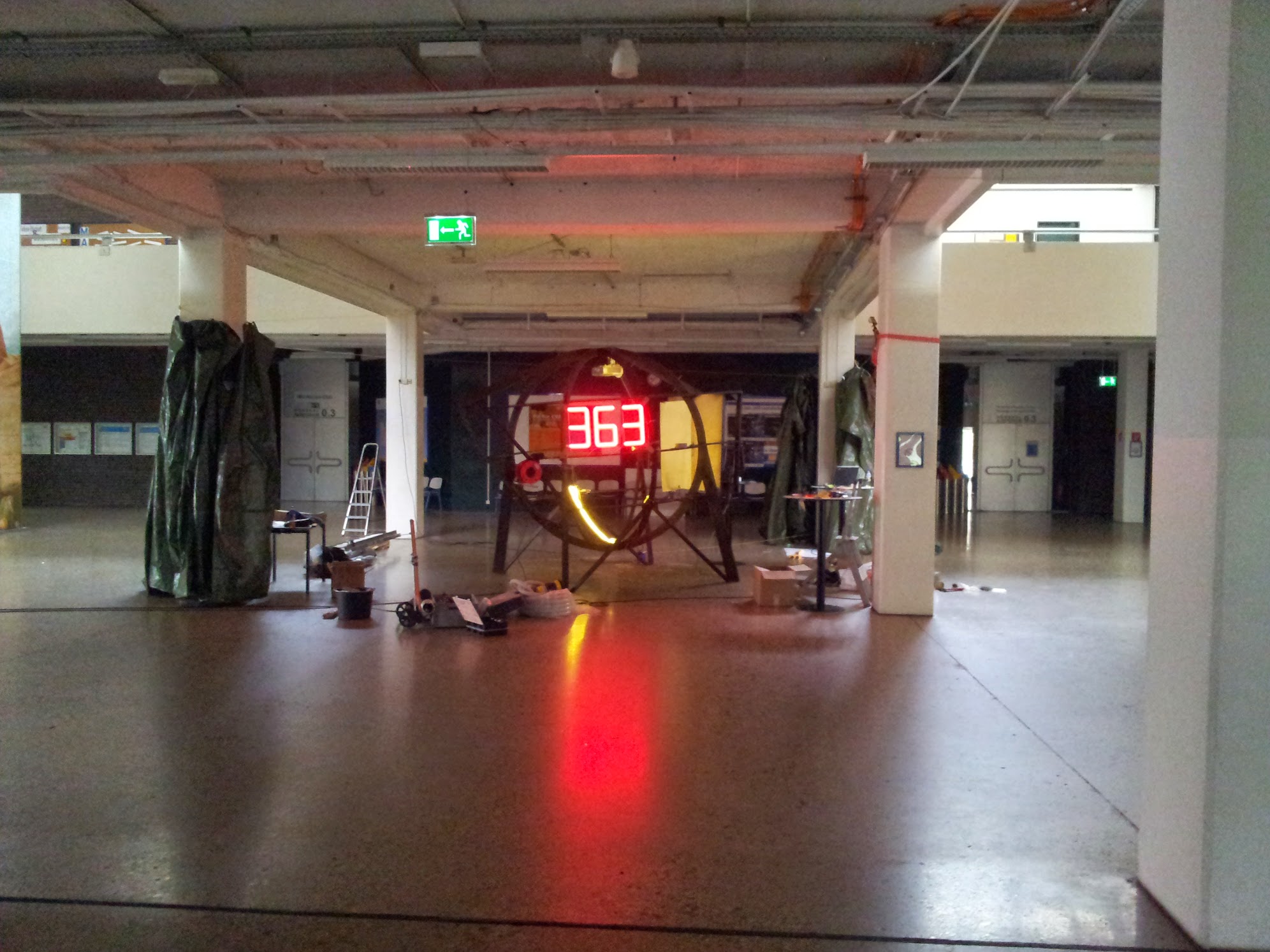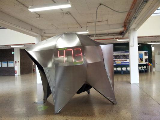 Der Counter visualisierte die verbleibenden Tage bis zur Eröffnung und Übersiedelung auf den neuen WU-Campus. Unsere Umsetzung basierte auf einer selbst entwickelten Ansteuerungsplatine, die eine Siebensegmentanzeige aus roten LED-Stripes steuerte. Diese minimalistische und zugleich wirkungsvolle Lösung machte den Countdown zu einem prägnanten visuellen Element der Installation.