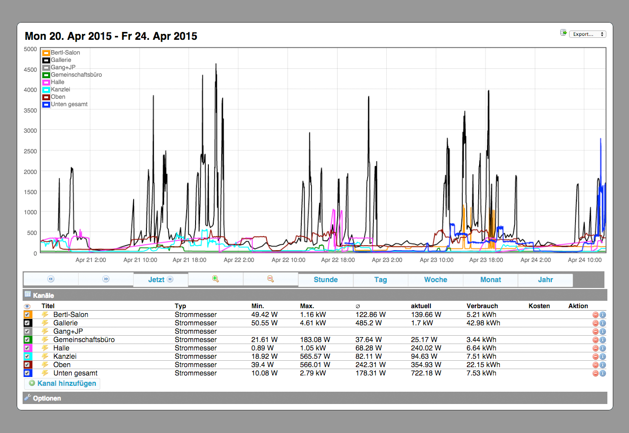 Ein Hutschienen-kompatibler Stromzähler mit S0-Schnittstelle misst den Verbrauch und sendet Impulse, die über ein NetIO-Modul erfasst und an das System übertragen werden. So können Strom, Temperatur, Luftfeuchtigkeit und andere Werte zentral dokumentiert und grafisch ausgewertet werden.