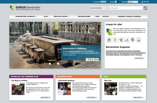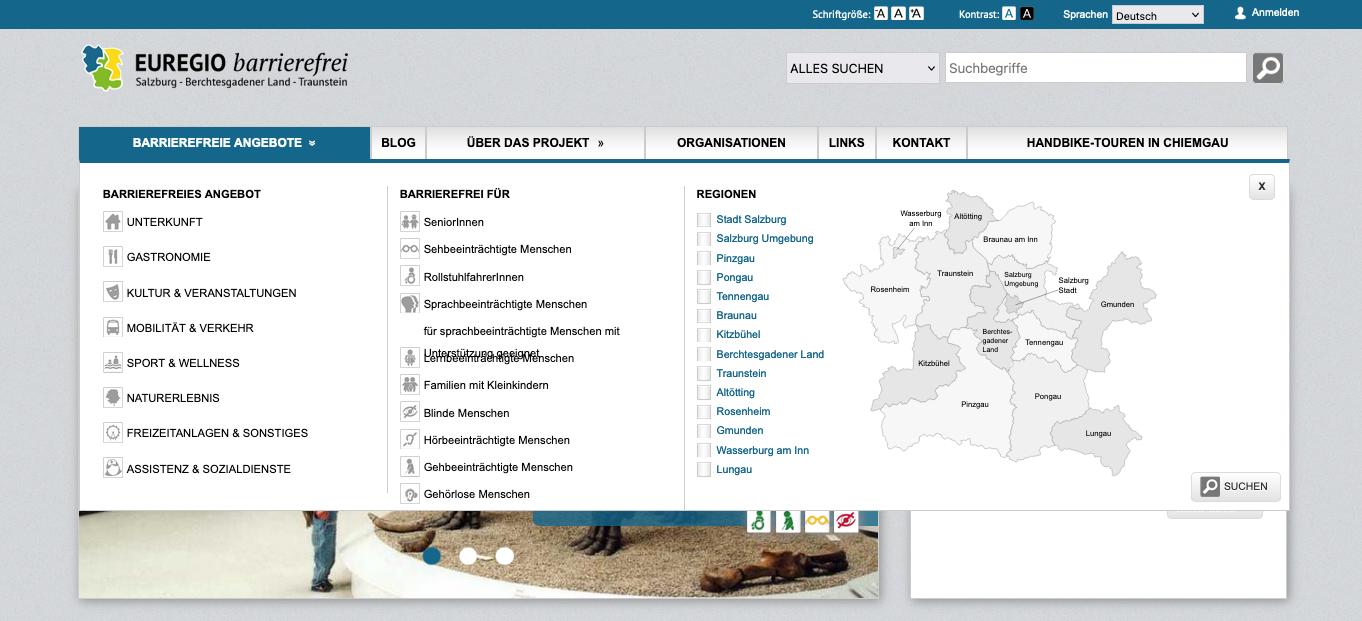 Die Webseite www.euregio-barrierefrei.eu richtet sich sowohl an Personen im Raum Salzburg - Berchtesgadener Land - Traunstein, die einen barrierefreien Urlaub planen, als auch an die Einwohner der Region. Sie bietet detaillierte Informationen über barrierefreie Ausflugsziele, Freizeiteinrichtungen, Restaurants, Hotels und mehr in der Region. Durch die Zusammenarbeit mit Expertinnen und Experten wurden zahlreiche Orte in Bezug auf ihre Zugänglichkeit für Menschen mit unterschiedlichen Beeinträchtigungen untersucht.