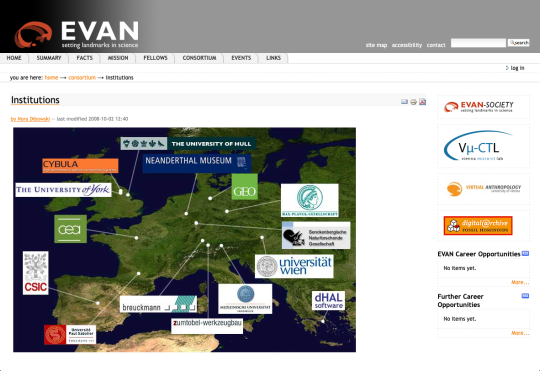Während meiner Tätigkeit als Technische Assistentin am Department of Virtual Anthropology der Universität Wien (2005–2007) entwickelte ich das Websystem für das EU-geförderte Projekt EVAN – Setting Landmarks in Science.