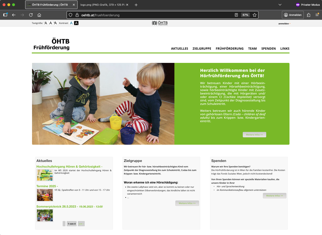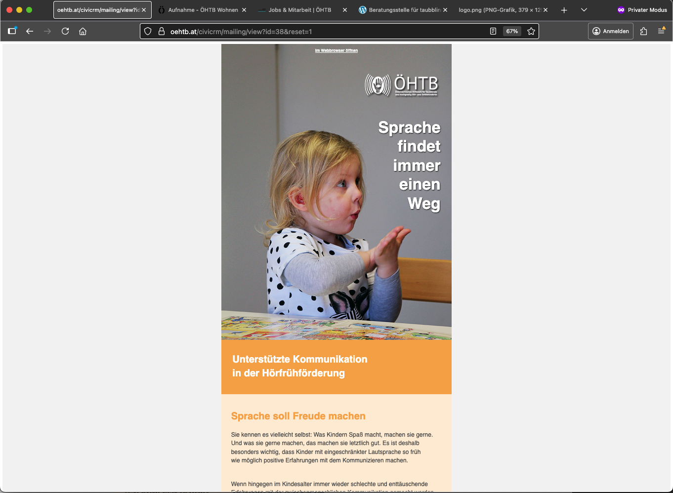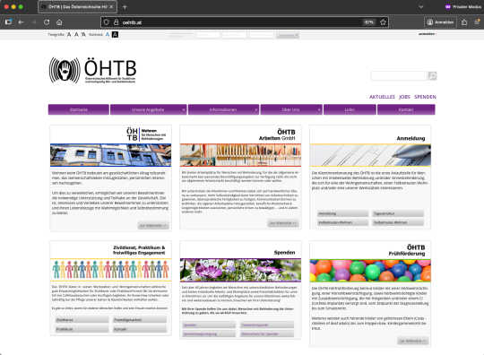Die Webseite des ÖHTB (Österreichisches Hilfswerk für Taubblinde und hochgradig Hör- und Sehbehinderte) wurde auf Basis des Content-Management-Systems Drupal 7 vollständig neu gestaltet. Eine besondere Herausforderung bestand darin, eine klare Struktur für den Mutterverein mit seinen Bereichen ÖHTB Wohnen GmbH, ÖHTB Arbeiten GmbH, ÖHTB Dienstleistungen GmbH und der ÖHTB Frühförderung zu entwickeln. Durch die Umsetzung mittels Unterwebseiten mit eigener Farbgestaltung und einem differenzierten Benutzerrollensystem konnte eine flexible und zugleich übersichtliche Lösung geschaffen werden. Die Mitarbeiter:innen des ÖHTB können die Inhalte ihrer jeweiligen Unterseiten selbstständig pflegen, und das System wird laufend um neue Funktionen erweitert. Im Jahr 2020 wurde das Open-Source-CRM-System CiviCRM integriert, um Newsletter- und Spendenkampagnen online zu versenden und zu verwalten. Seither werden parallel zu den postalischen Spendenaufrufen auch monatliche Online-Kampagnen durchgeführt.