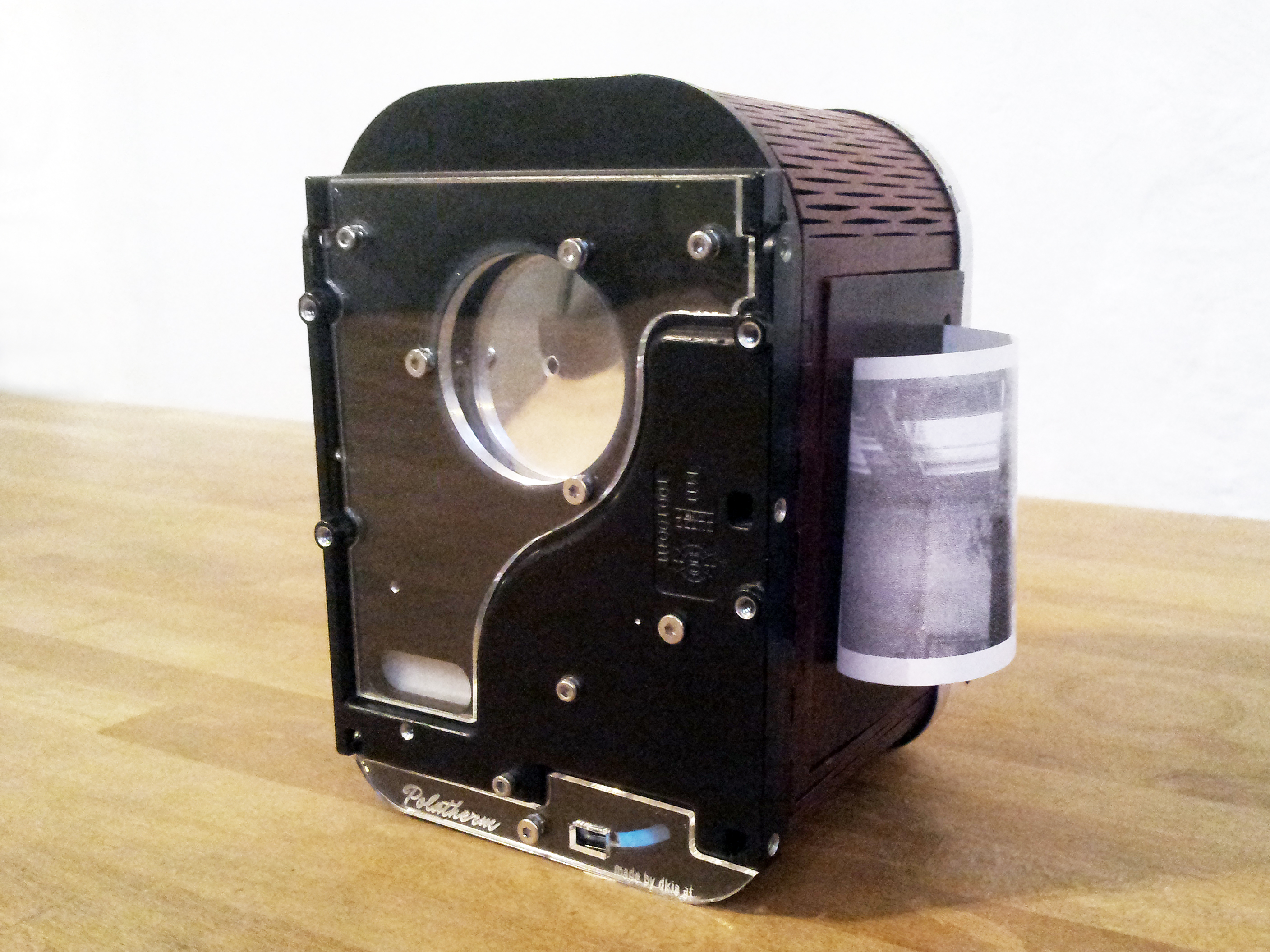 Im Inneren arbeitet ein Raspberry Pi, verbunden mit einer Raspberry Pi Kamera und einem Thermodrucker (Cashinotech CSN-A2-T). Zwei Modellbauakkus sorgen für Energie, der Ladestand wird über farbige LEDs angezeigt. Jedes Bild wird auf einer MicroSD-Karte gespeichert, und die Texte im Header und Footer der Ausdrucke lassen sich individuell anpassen.