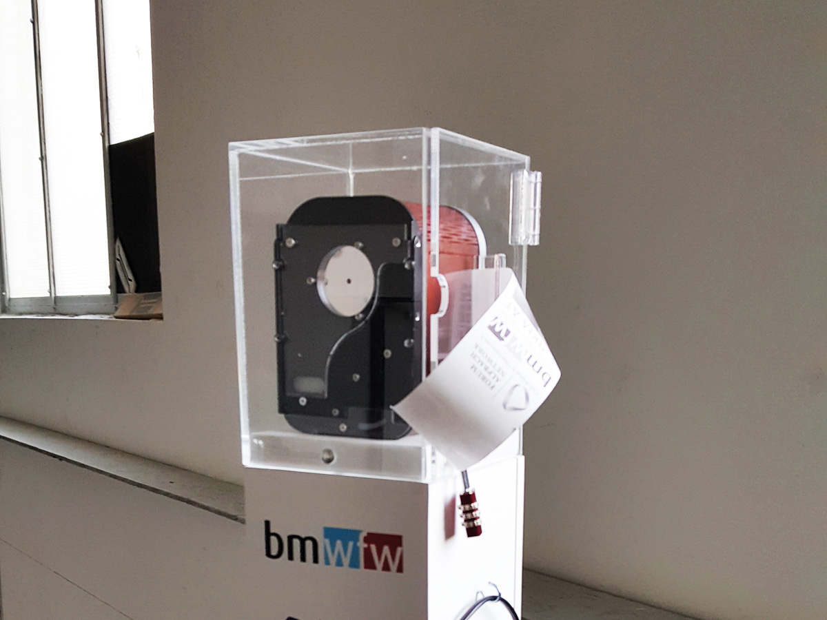 Das Gehäuse kombiniert Technik mit Upcycling und Handwerkskunst: Die Front- und Rückplatten stammen aus dem Gehäuse einer alten Festplatte, während der Korpus aus Pappelholz gefertigt ist. Das Holz wurde so gelasert, dass sich seine Kanten flexibel biegen lassen – inspiriert vom Prinzip der parametric Flexbox. Acrylglas-Elemente auf der Vorderseite runden das Design ab. Die Laserarbeiten entstanden im Wiener FabLab Happylab.