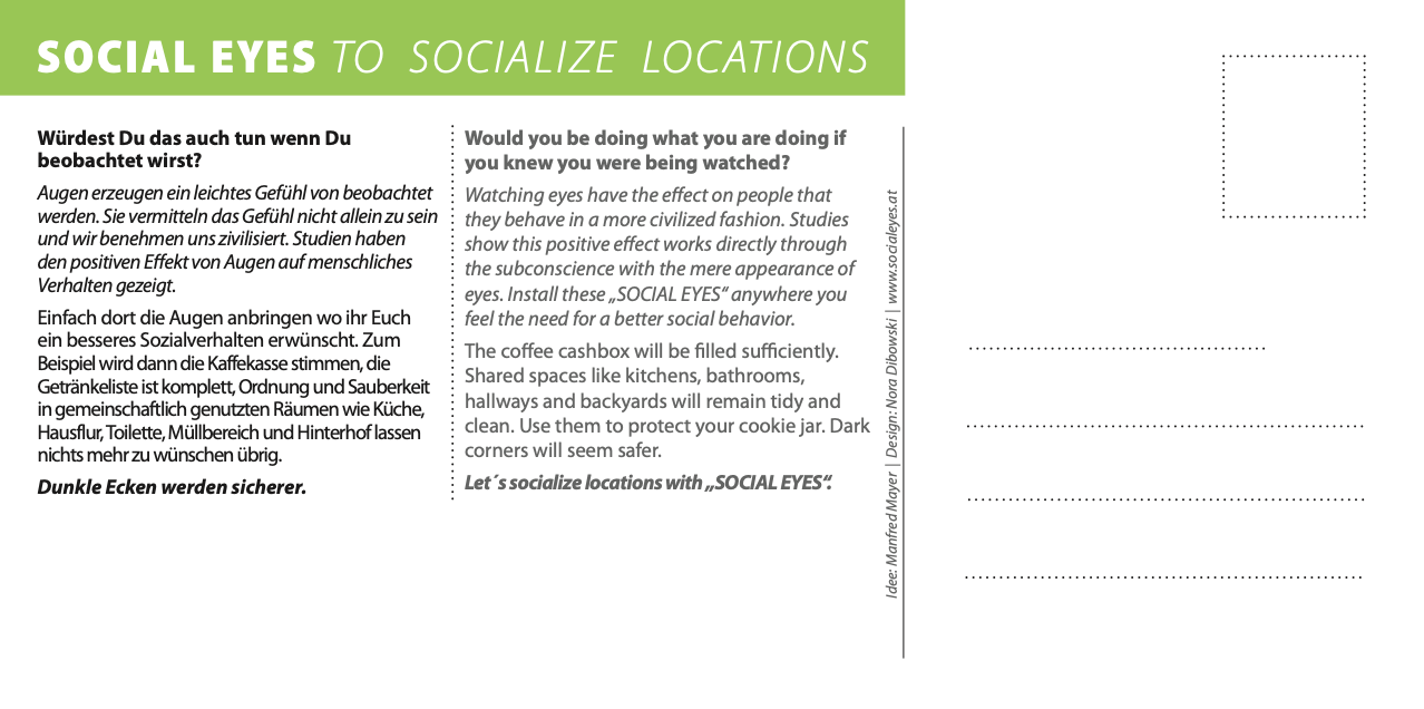 Die Idee besteht darin, die Augen dort anzubringen, wo ein verbessertes Sozialverhalten erwünscht ist. Beispielsweise könnten sie dazu beitragen, dass die Kaffekasse korrekt geführt wird, die Getränkeliste vollständig ist und Ordnung sowie Sauberkeit in gemeinschaftlich genutzten Bereichen wie der Küche, dem Hausflur, der Toilette, dem Müllbereich und dem Hinterhof stets gewährleistet sind. Zudem tragen sie dazu bei, dunkle Ecken sicherer zu gestalten.