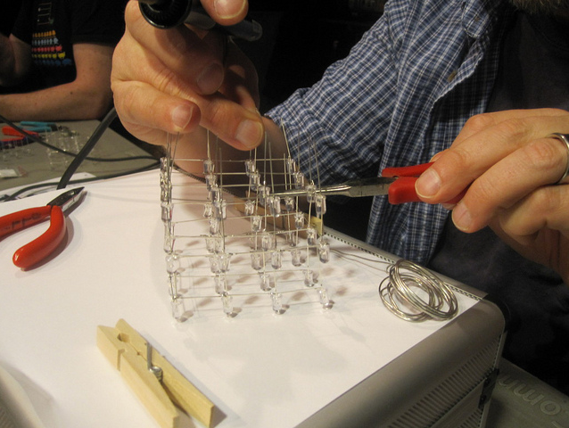 Der SwarmCube ist als 4x4x4 LED-Würfel aufgebaut, wobei jede Schicht 16 LEDs enthält. Der Würfel misst 6x6x6 cm und ist 16 x 4-multiplexiert, mit 16 gemeinsamen Anoden und 4 gemeinsamen Kathoden.