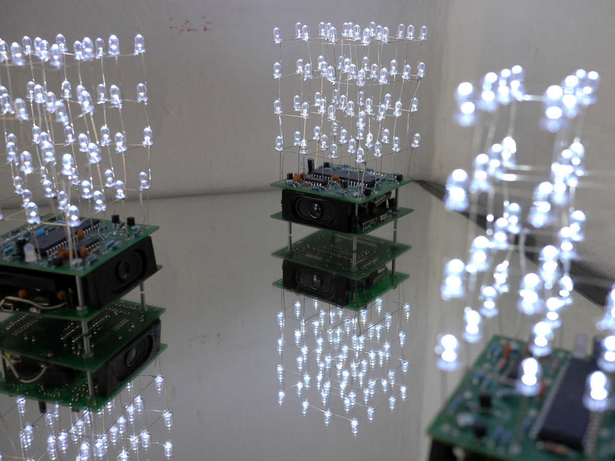 Ein dreidimensionaler Würfel aus Licht, der sich in ständiger Wandlung von Helligkeit, Zeit und Rhythmus befindet. Über einen Lautsprecher und einem Mikrophon, der “Kommunikationsebene” kann er Töne und einfache Melodien von sich geben und auch darauf reagieren. Ein einzelner Swarm Cube ist fremdgesteuert, d.h. wir “Erbauer” können mittels Computer oder Handy den Cube kontrollieren und ihm Verhaltensinstruktionen geben. In einem Kollektiv von SWARMCUBES jedoch entwickelt sich ein emergentes System, ein Prozess autonomer Kommunikation und Lichtbewegungen. Je größer die Anzahl der Swarm Cubes desto einzigartiger wird die kinetische Lichtskulptur, desto selbstorganisierter die Veränderung von Zuständen.
