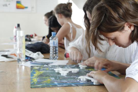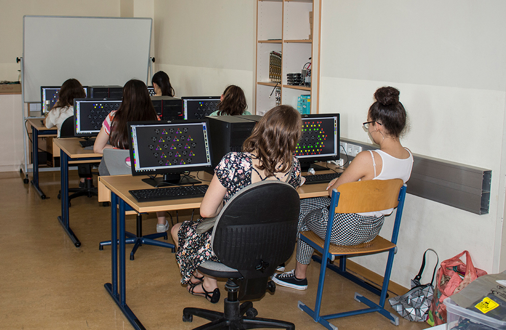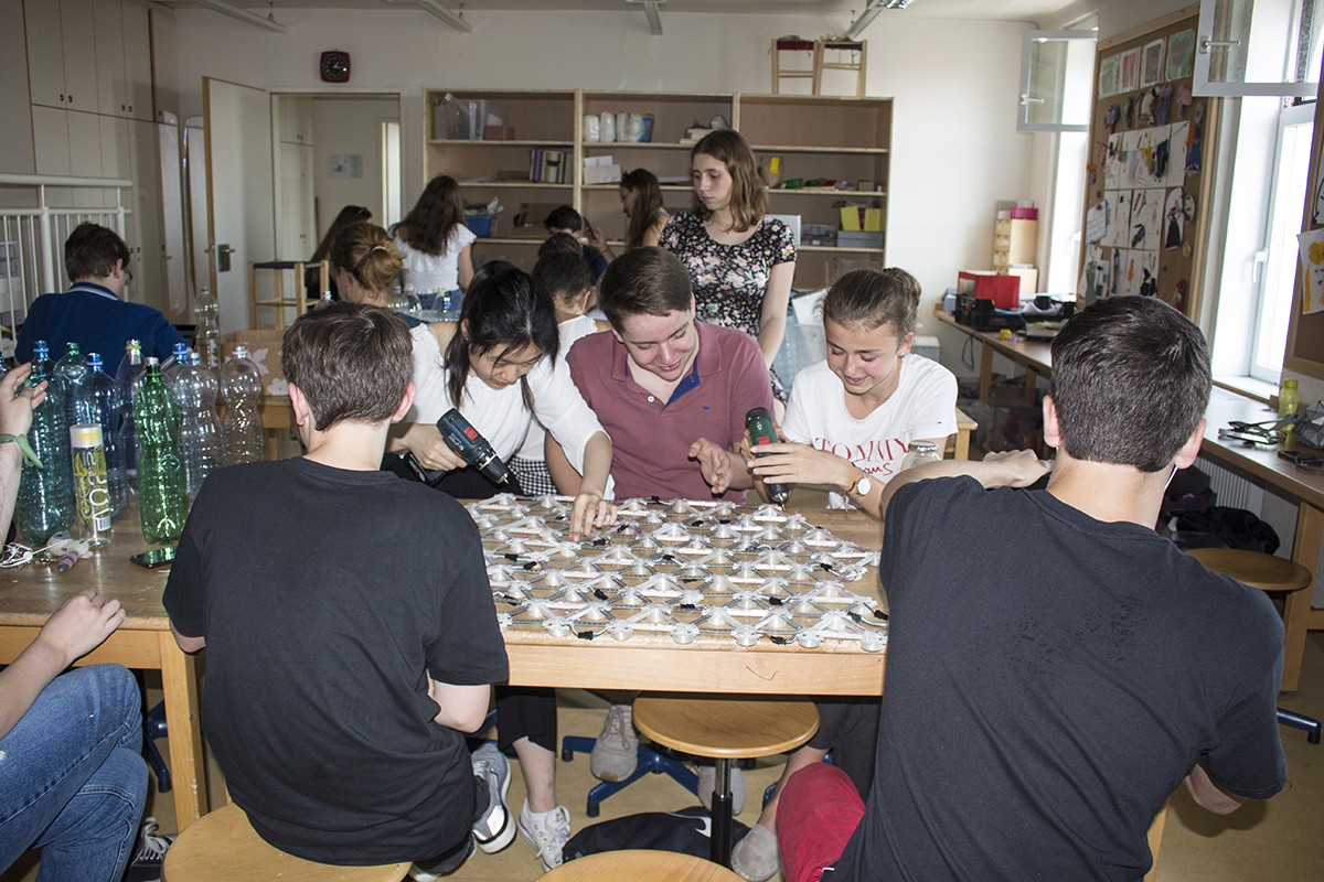Im viertägigen Workshop „Three Quarks for Muster Mark“ setzten sich die Schüler:innen kreativ und technisch mit dem Thema auseinander. Sie entwickelten eine Lichtinstallation aus recycelten PET-Flaschen. Jede Schülerin und jeder Schüler fertigte ein Grundmodul an, bestehend aus drei PET-Flaschen, die symbolisch für drei Quarks – und damit für ein Proton oder ein Neutron – stehen könnten. Die fertige Installation umfasst 30 Module, also 30 Protonen oder Neutronen, und besteht insgesamt aus 90 PET-Flaschen.