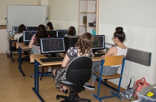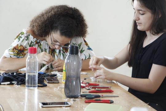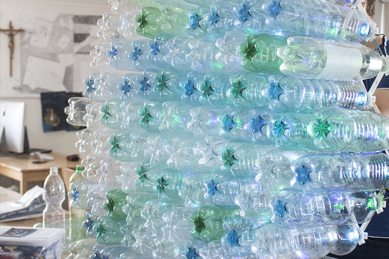 Das zentrale Element der Installation ist ein Wechselspiel aus Farben, Bewegung und Leuchtkraft, das durch eine Arduino-Mikrocontroller-Plattform gesteuert wird. Die notwendigen Verbindungsstücke und Aufhängungen für die PET-Flaschen wurden mithilfe eines 3D-Druckers hergestellt. Arduino, eine Open-Source-Plattform, ermöglichte den Schüler:innen, ihre Lichtinstallation selbstständig in der Programmiersprache C zu entwickeln.