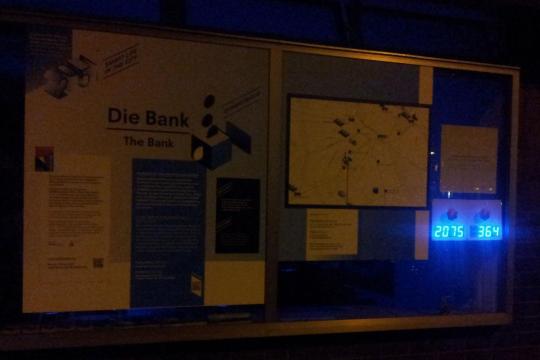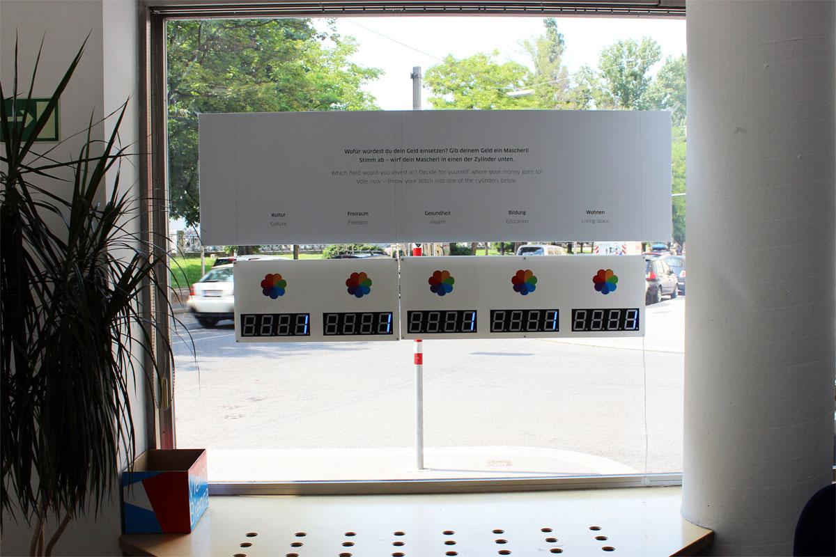 Im Rahmen der Vienna Biennale "Ideas for Change" haben Simon Laburda und ich fünf interaktive Wahlmodule für Passanten und Besucher für die Bank für Gemeinwohl entwickelt. Diese Module ermöglichten es den Teilnehmern, ihre Stimme zu den Bereichen Kultur, Freiraum, Gesundheit, Bildung und Wohnen abzugeben, indem sie das entsprechende Logo auf der Außenseite der Fensterscheibe berührten. Bei jeder Berührung sprang der Zähler des jeweiligen Moduls um eine Zahl nach oben.