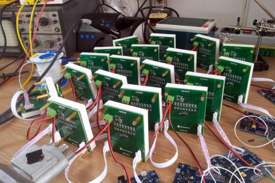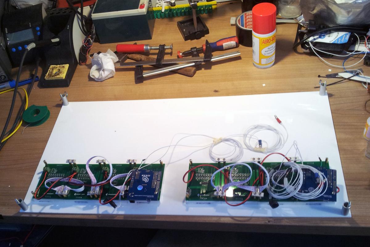 Für die Berührungserkennung wurde auf beiden Seiten der Fensterscheibe eine Metallfolie angebracht und mit einem IO-Pin eines Arduino-Mikrocontrollers verbunden. Der Arduino misst kontinuierlich die Kapazität: Wenn ein Finger auf die Folie gelegt wird, steigt die Kapazität schnell an. Dieser Anstieg wird als Auslöser für die Berührungserkennung verwendet.